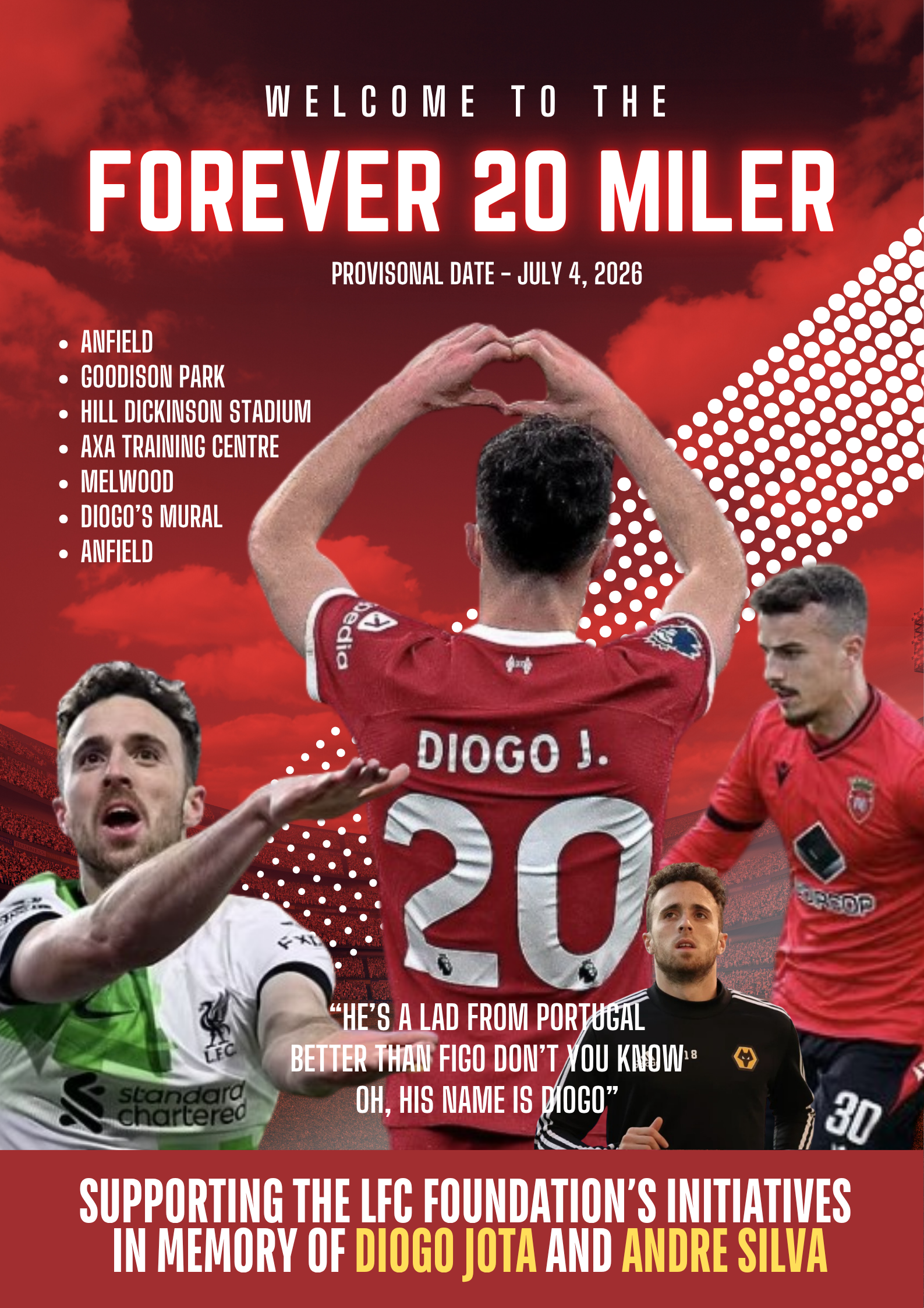 The LFC Foundation is establishing a footballing initiative in the name of Diogo and Andre. The Forever 20 Miler is an opportunity for football supporters to support that initiative and remember their heroes one year on from their tragic passing.