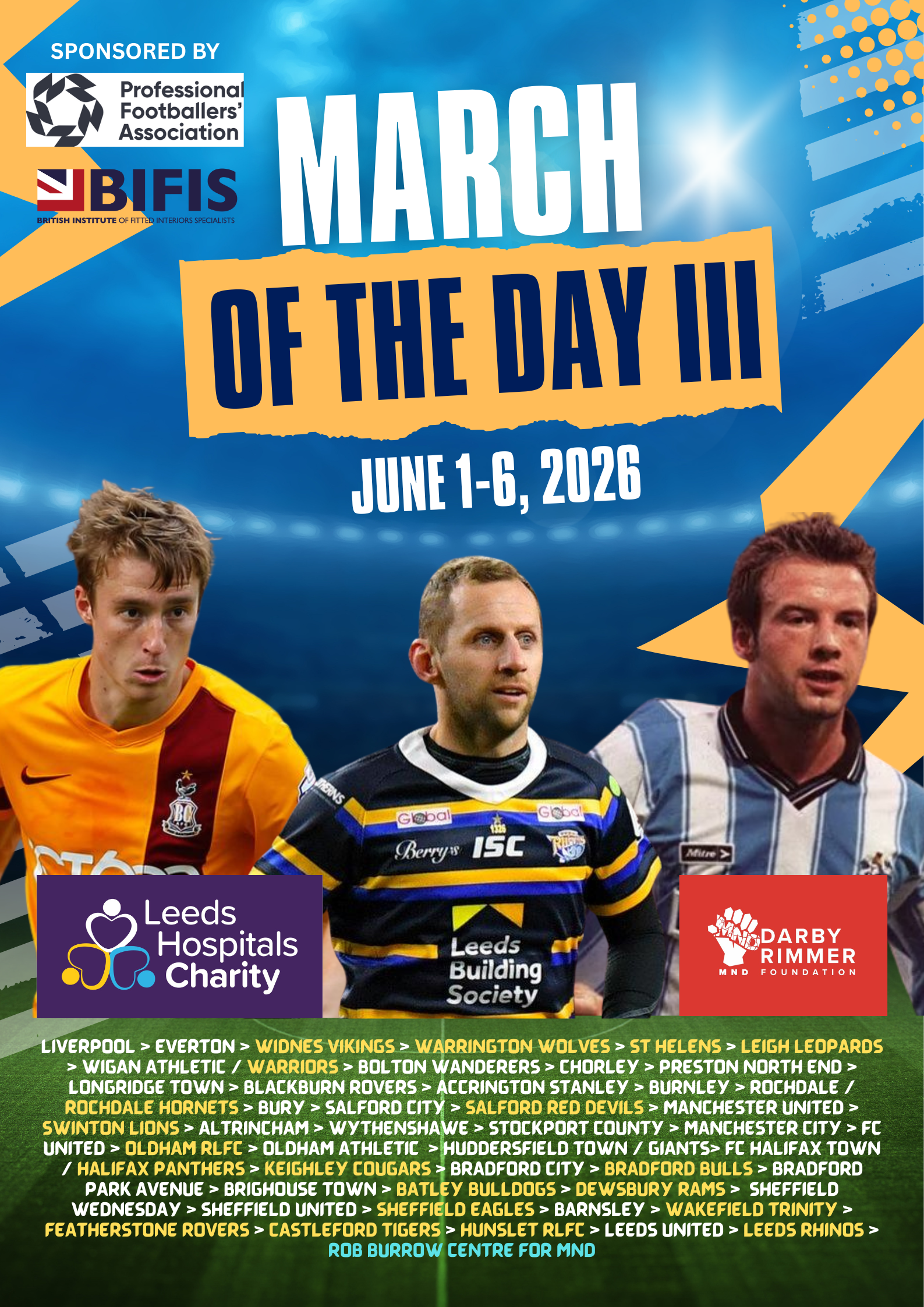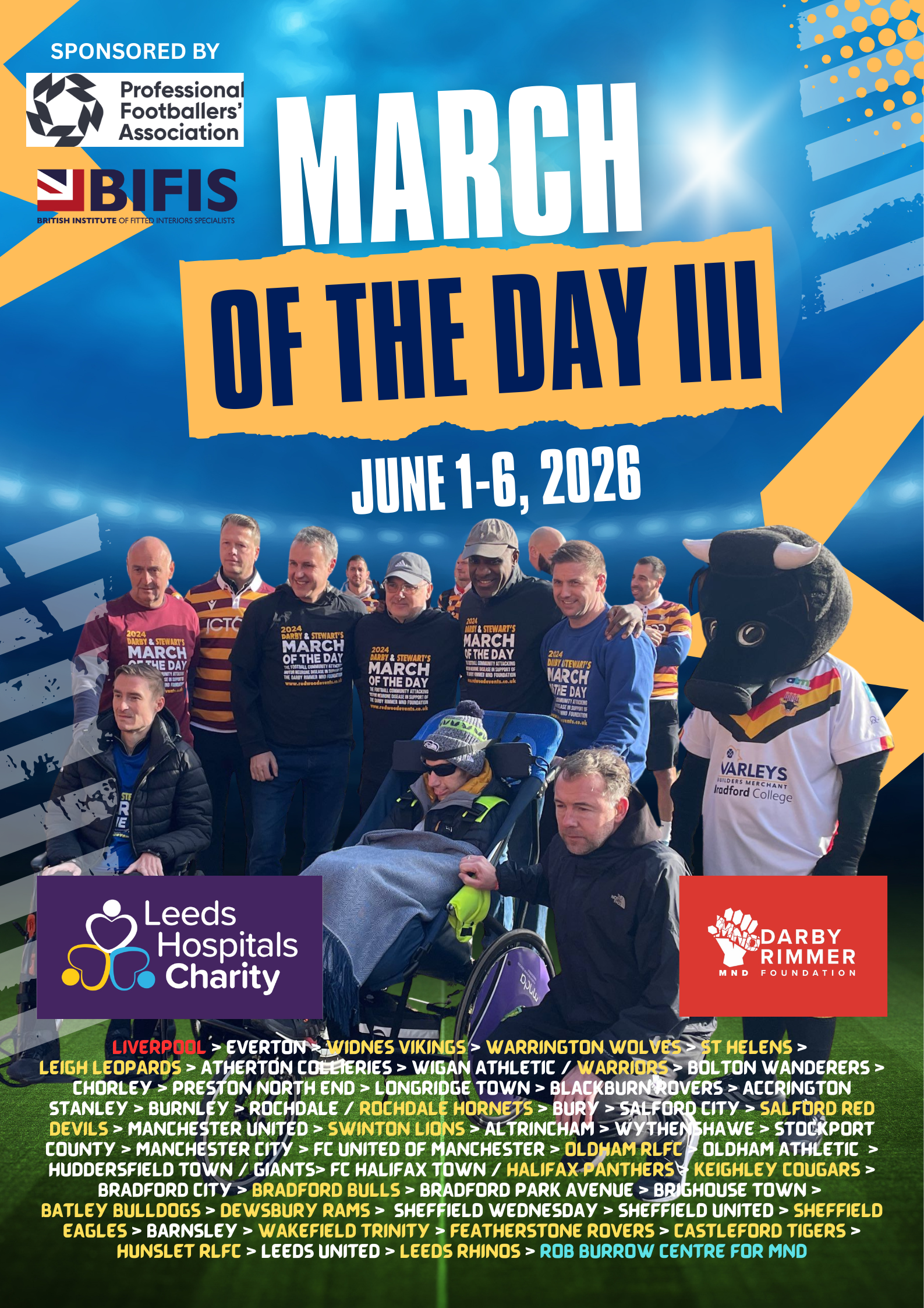 Following the success of the March of the Day events in 2024 and 2025, we needed to think of an event that would top these. In 2026, we are looking to bring the football and rugby league world together. So March of the Day III will support both the Darby Rimmer MND Foundation and the Leeds Hospitals Charity.
