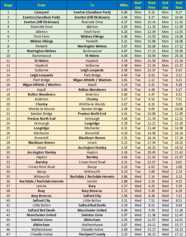 The event starts at Liverpool FC where Stephen Darby began his football career,. The route then heads through the north west heartland for rugby league before heading north through Bolton where Stephen finished his playing career. Further north, we pass through Preston, where Marcus Stewart had a short spell. Next stop is Longridge, where George Melling, who sadly died from MND, played for many years.