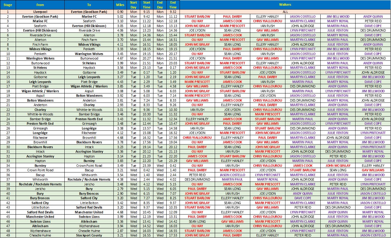 This is the walking rota for the first core team covering Liverpool to Stockport County on June 1-3, 2025. The names in bold have been officially recruited. The other names will be added when they join the team.