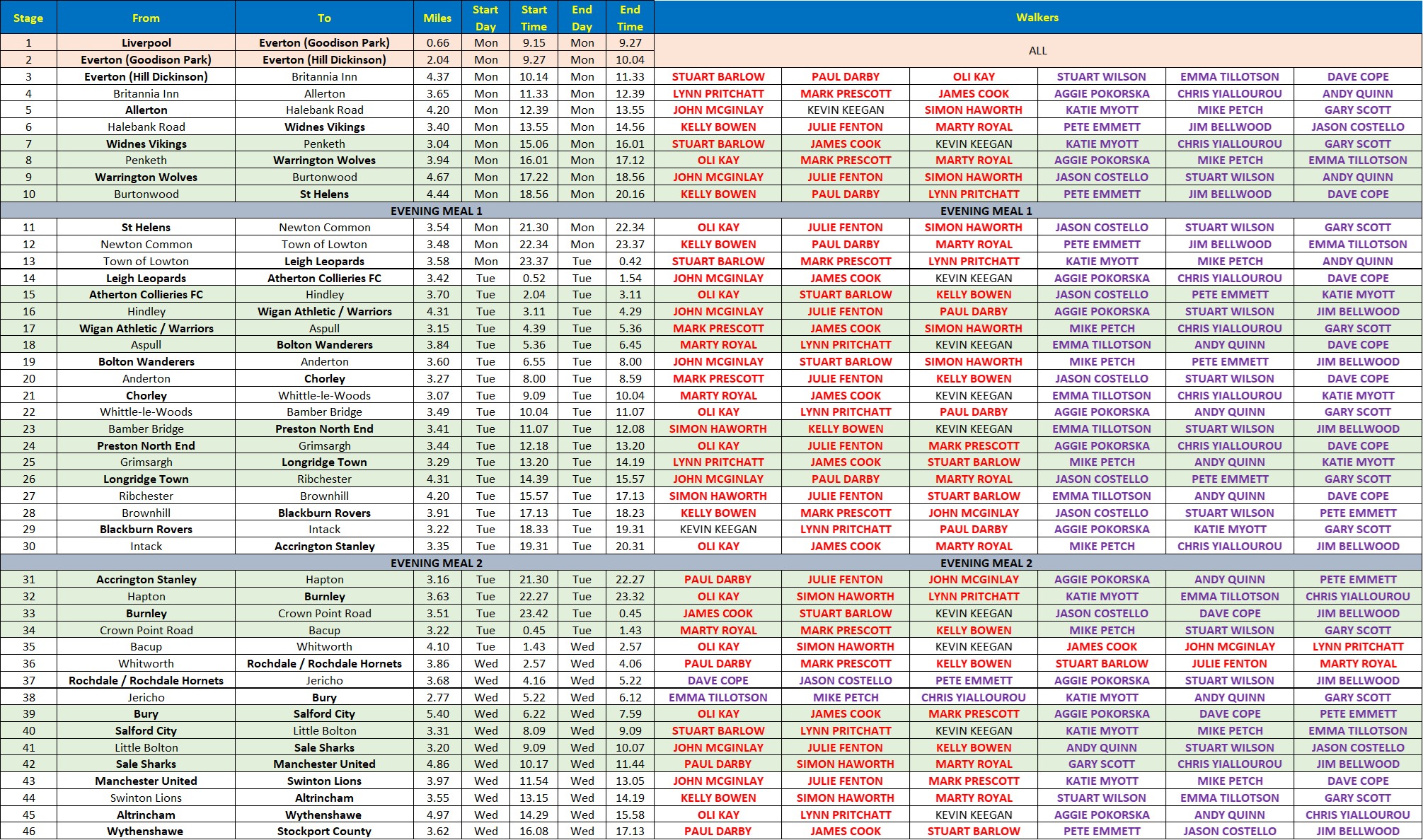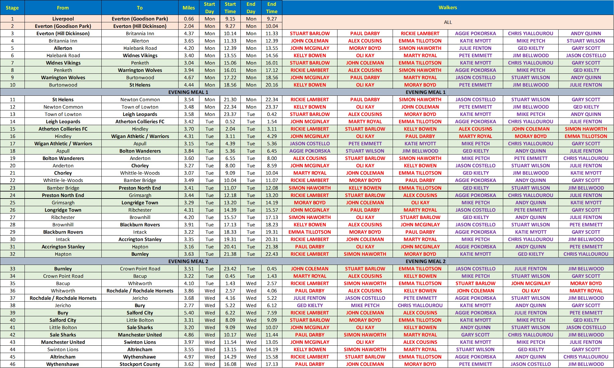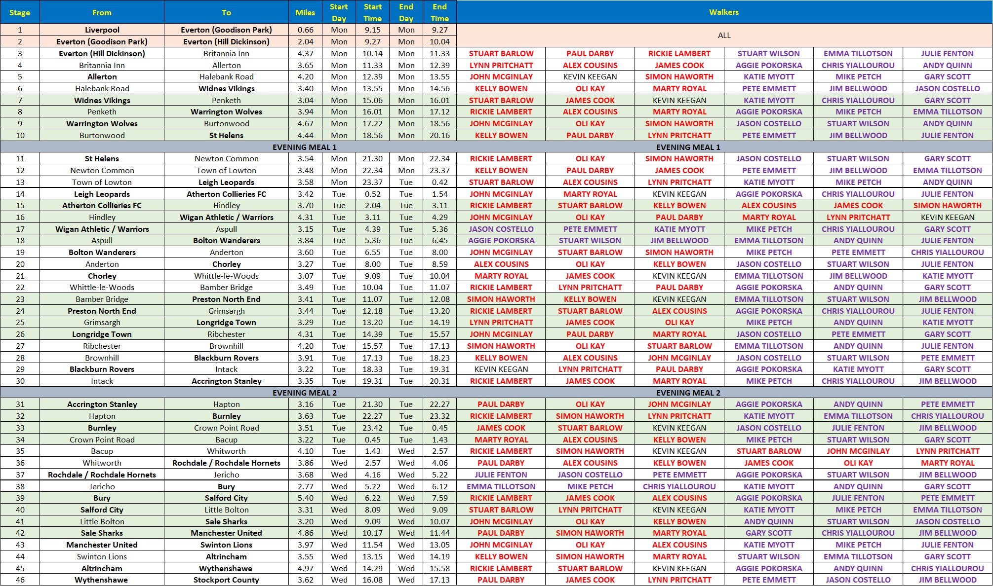 This is the walking rota for the first core team covering Liverpool to Stockport County on June 1-3, 2025. The names in bold have been officially recruited. The other names will be added when they join the team.