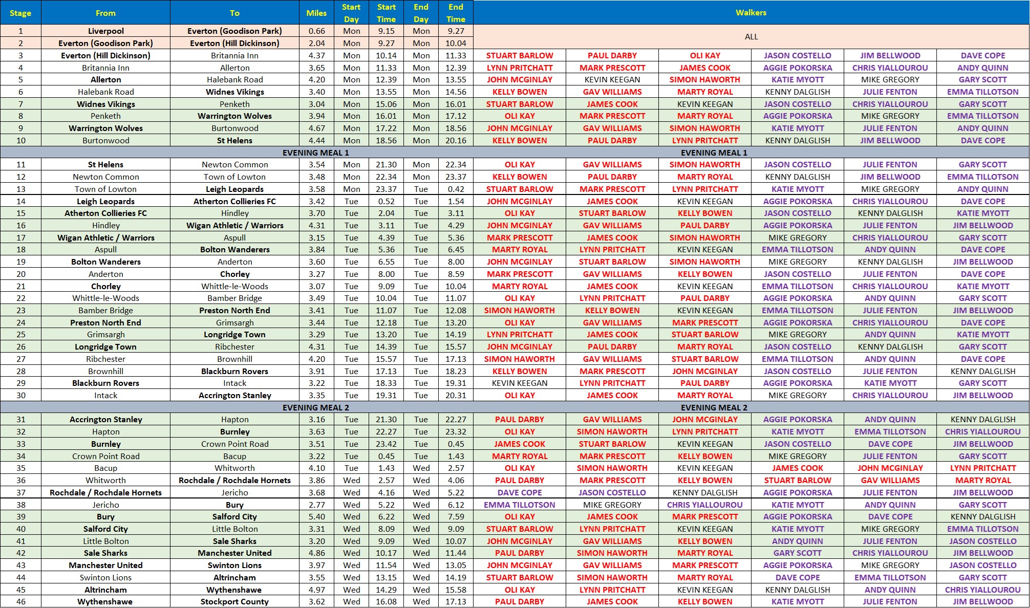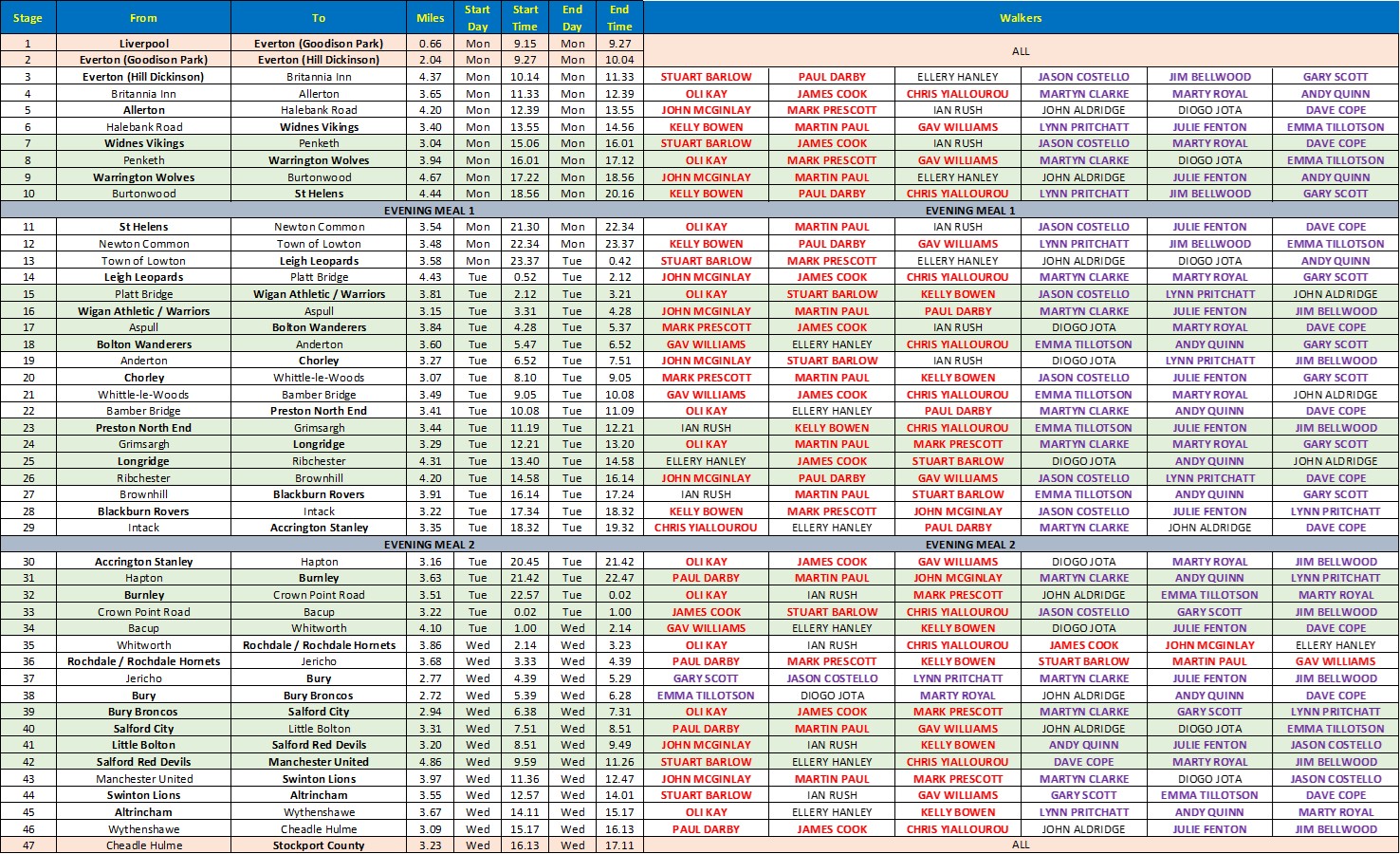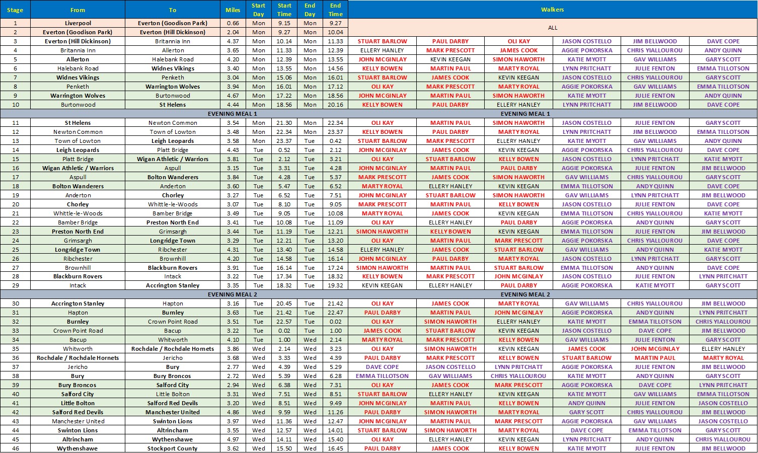 This is the walking rota for the first core team covering Liverpool to Stockport County on June 1-3, 2025. The names in bold have been officially recruited. The other names will be added when they join the team.