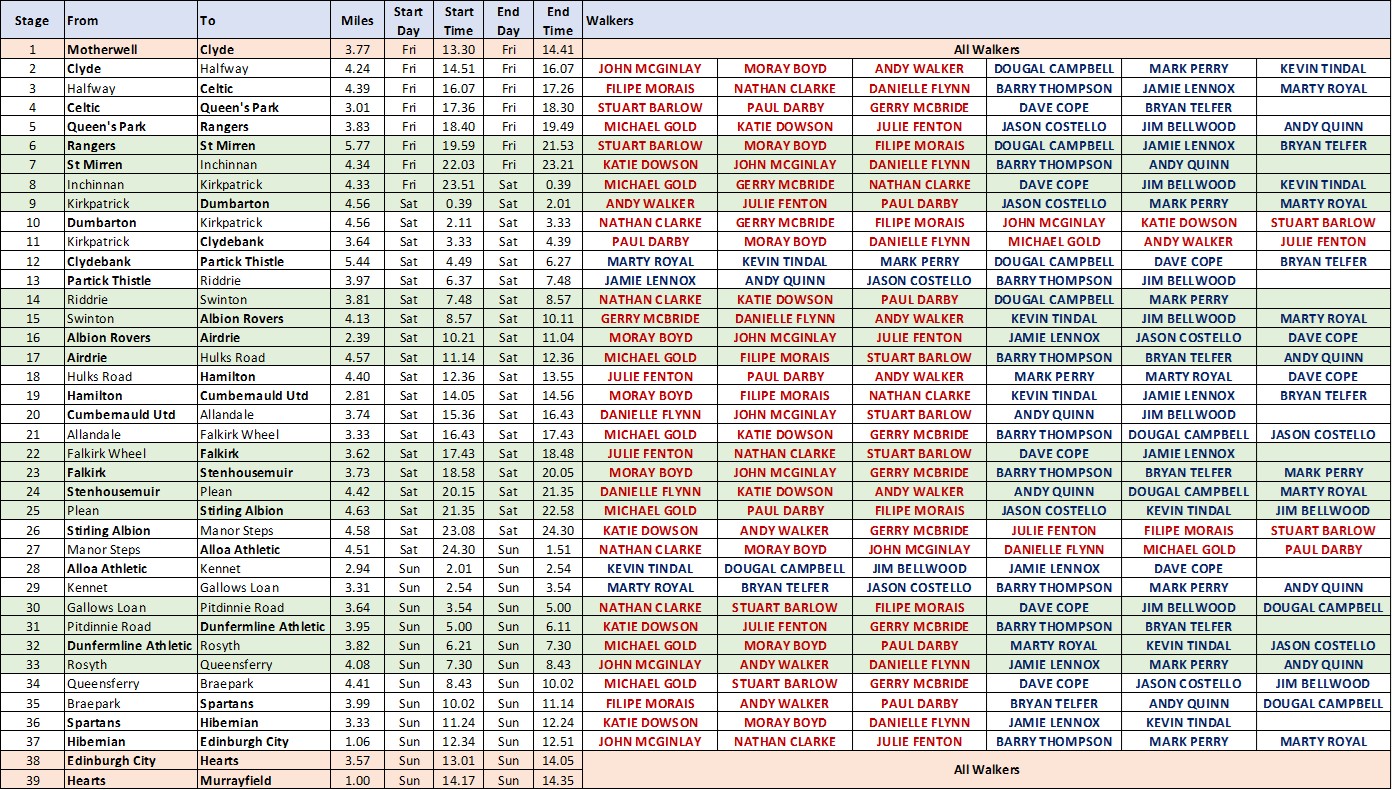 The Core Team has been recruited to take on the full distance. They complete the event in stages with seven of the twenty-eight person core team allocated to each stage. This is how the rota will work. The rota is populated current by the surnames of footballers. As the core team us recruited, these names will be replaced by the names of the walkers recruited into the teams. Names in Red will represent the Darby Rimmer MND Foundation. Those in blue are recruited by the My Name’5 Doddie Foundation.