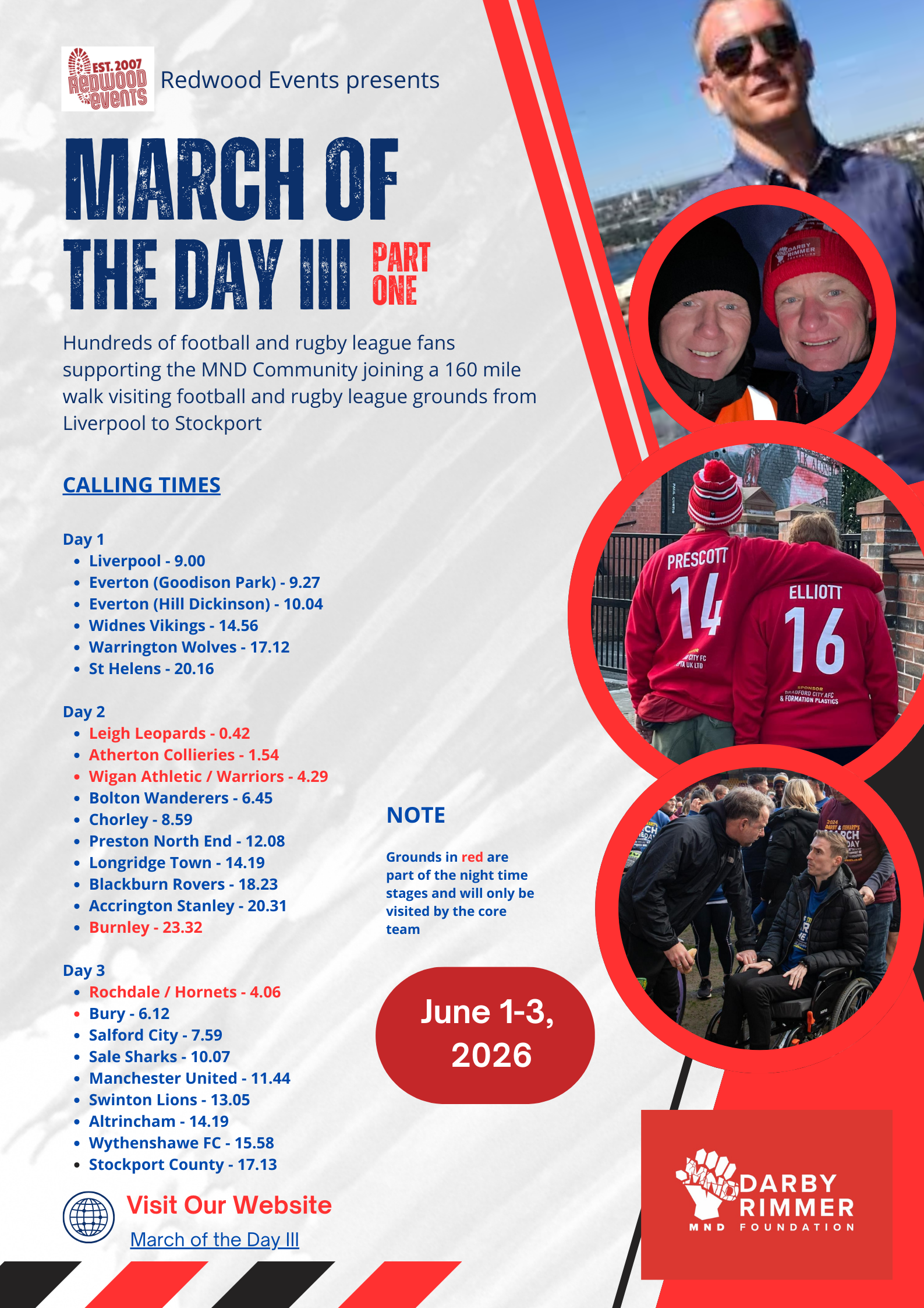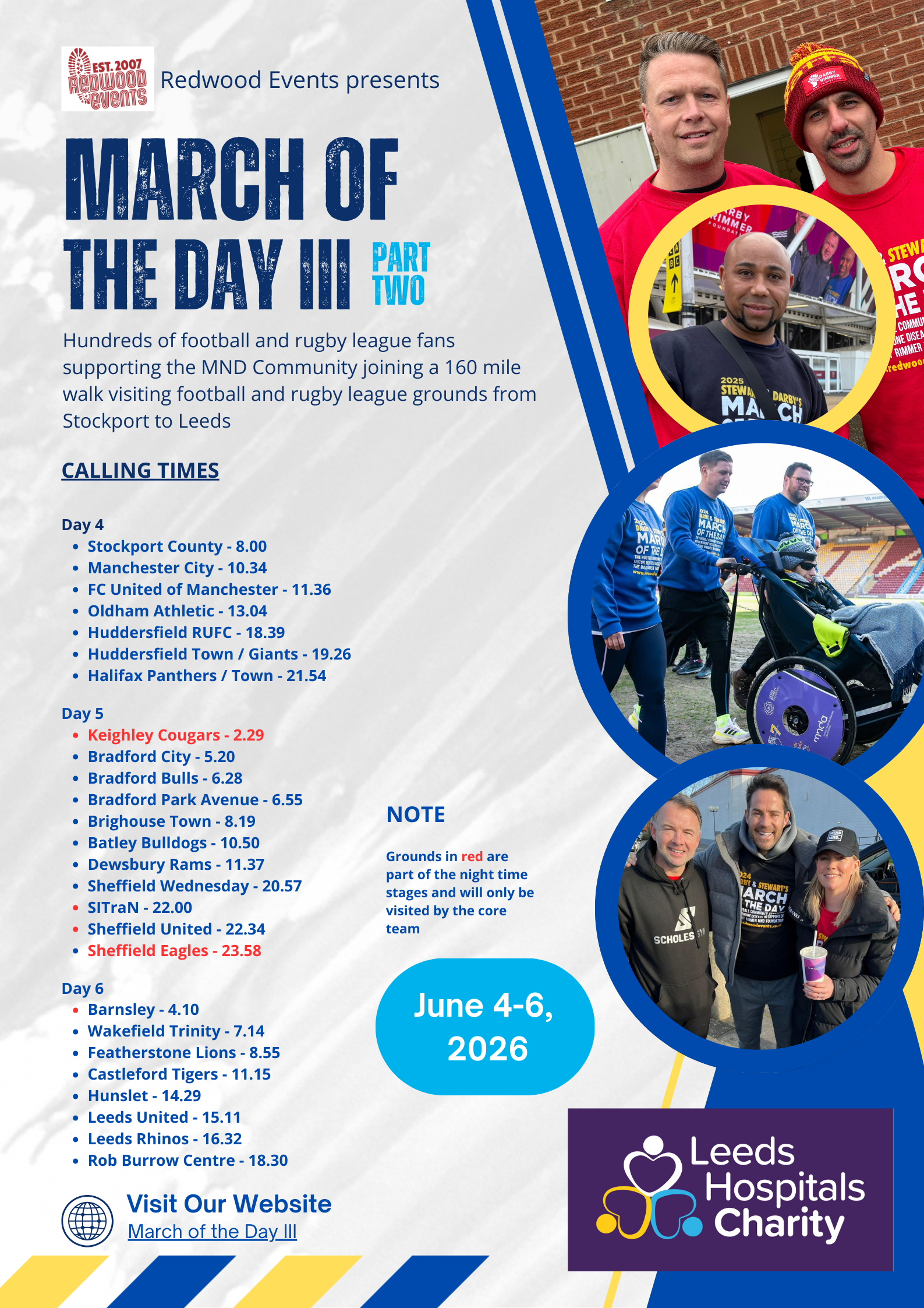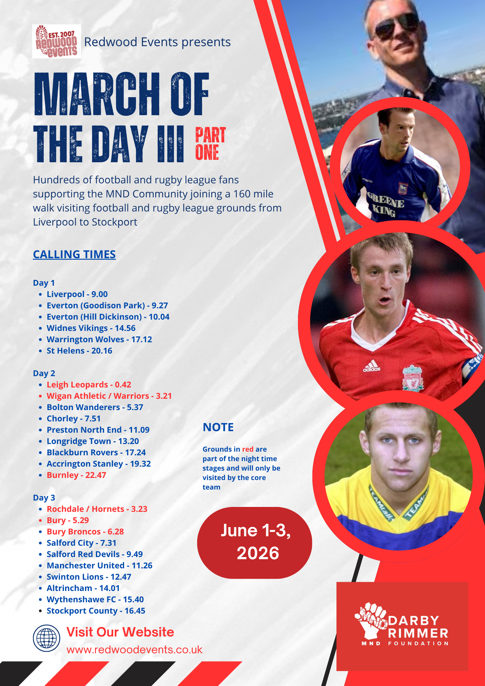 Following the successes of our previous March of the Day events, we have been determined to go bigger. March of the Day III is a 350 mile six day walk around 47 football and rugby league stadia between Liverpool, the home base of the Darby Rimmer MND Foundation and the Rob Burrow Centre in Leeds, being built through the Leeds Hospital Charity.